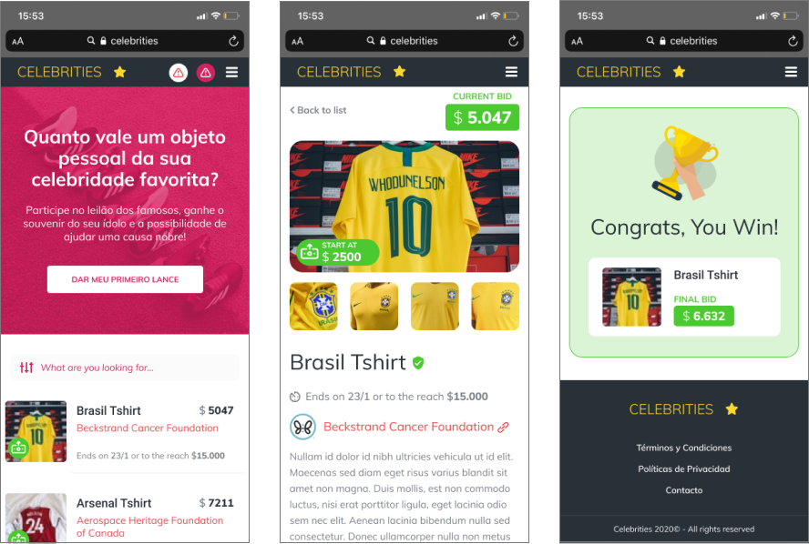 The Celebrities auction app is a high-fidelity prototype developed to showcase an innovative platform where fans can bid on personal items from their favorite celebrities. The proceeds from these auctions go to various charitable organizations, making it a win-win for both fans and causes.