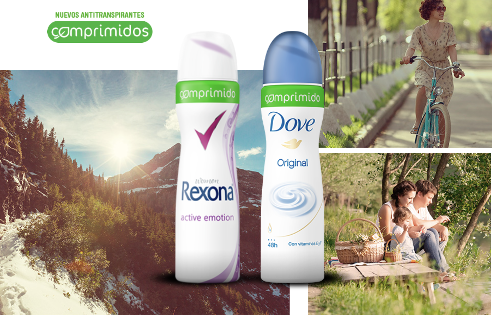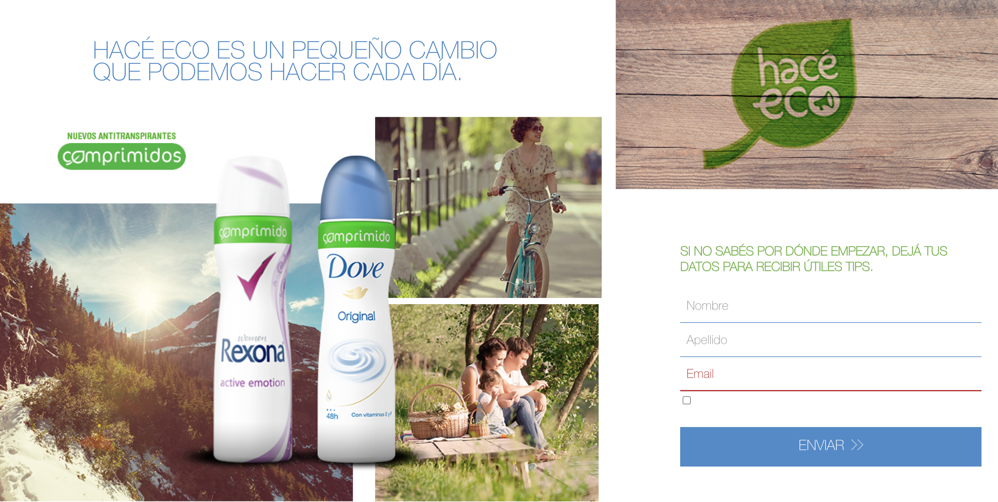 This landing page promotes Unilever's new compressed deodorants, highlighting their innovative design that offers the same protection with less packaging. Project Link.